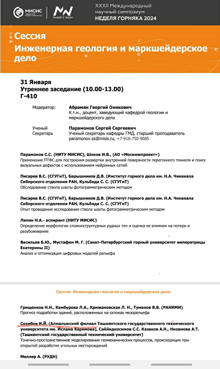 🔷На XXXII Международном научном симпозиуме “Неделя горняка-2024”, проходящем с 29 января по 2 февраля 2024 года в Москве и Санкт – Петербурге, доцент факультета Горного дела Алмалыкского филиала ТГТУ PhD Исомиддин Сахибов участвует вместе с научным руководителем профессором ТГТУ С.Саййидкосимовым.