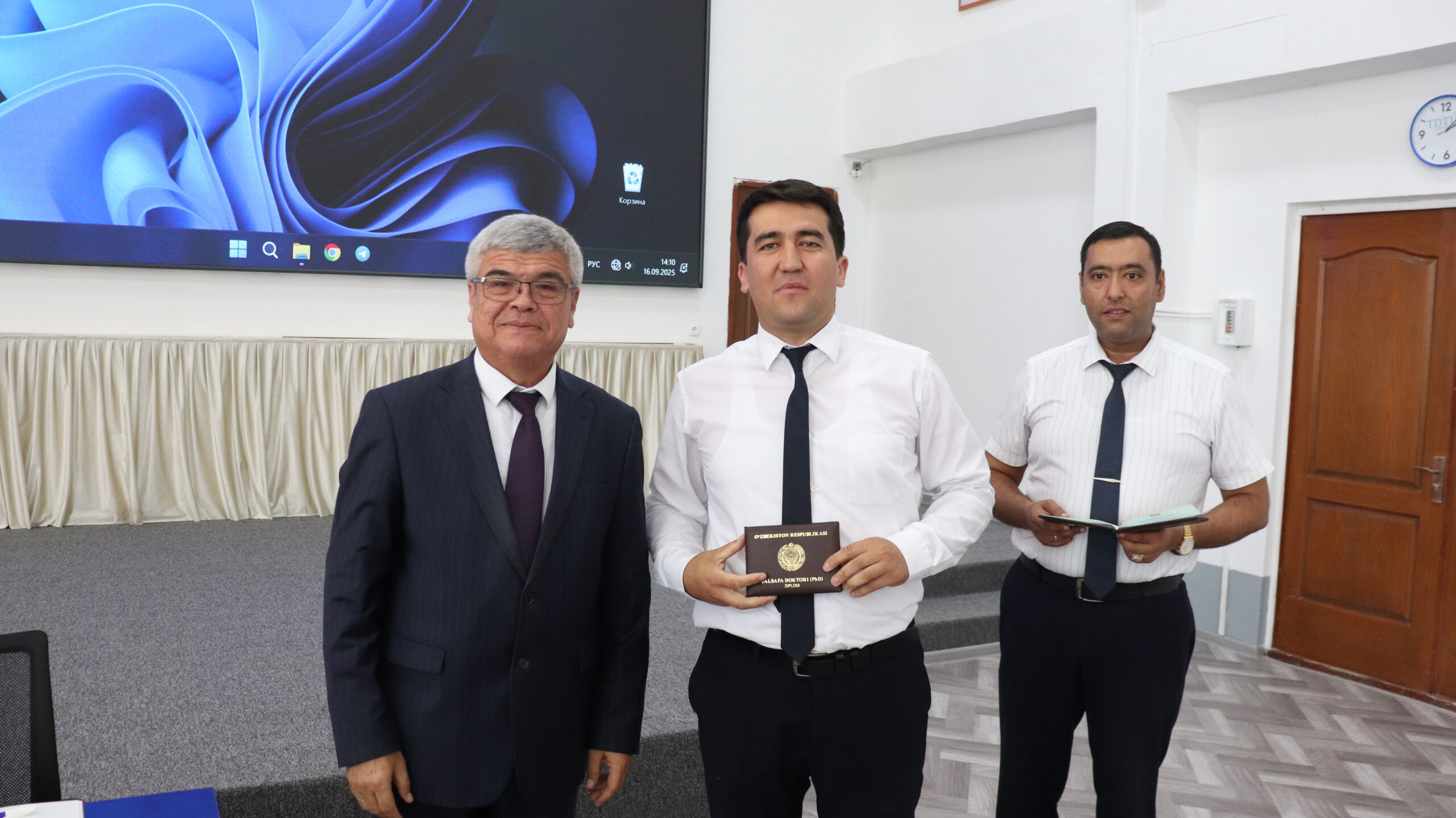Kengash avvalida filial ilmiy salohiyati oshishiga hissa qo‘shayotgan Ijtimoiy-gumanitar fanlar va tillar kafedrasi professor-o’qituvchilari Sh.Xakimov va M.Xakimovaga pedagogika fanlari bo‘yicha falsafa doktori ilmiy darajasi diplomlari topshirildi.
